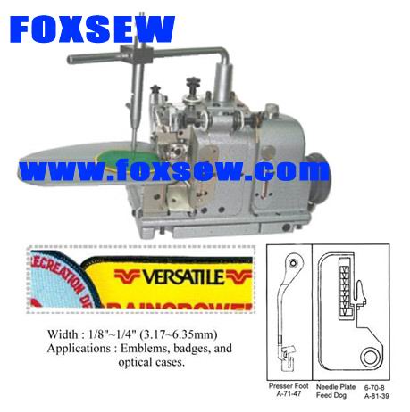 FX-160 Emblem Overedging швейная машина, расположенная для облегчения обработки материала, используемого в производстве эмблемы, включает в себя короткую ступню прессора, короткую кормовую собаку и руководство по краю.FX-160 обычно используется без резаков для формирования эмблемы швов быстро и легко и позволяет оператору поворачивать углы в работе без усилийРекомендуемая скорость FX-160 составляет 5500 швов в минуту.